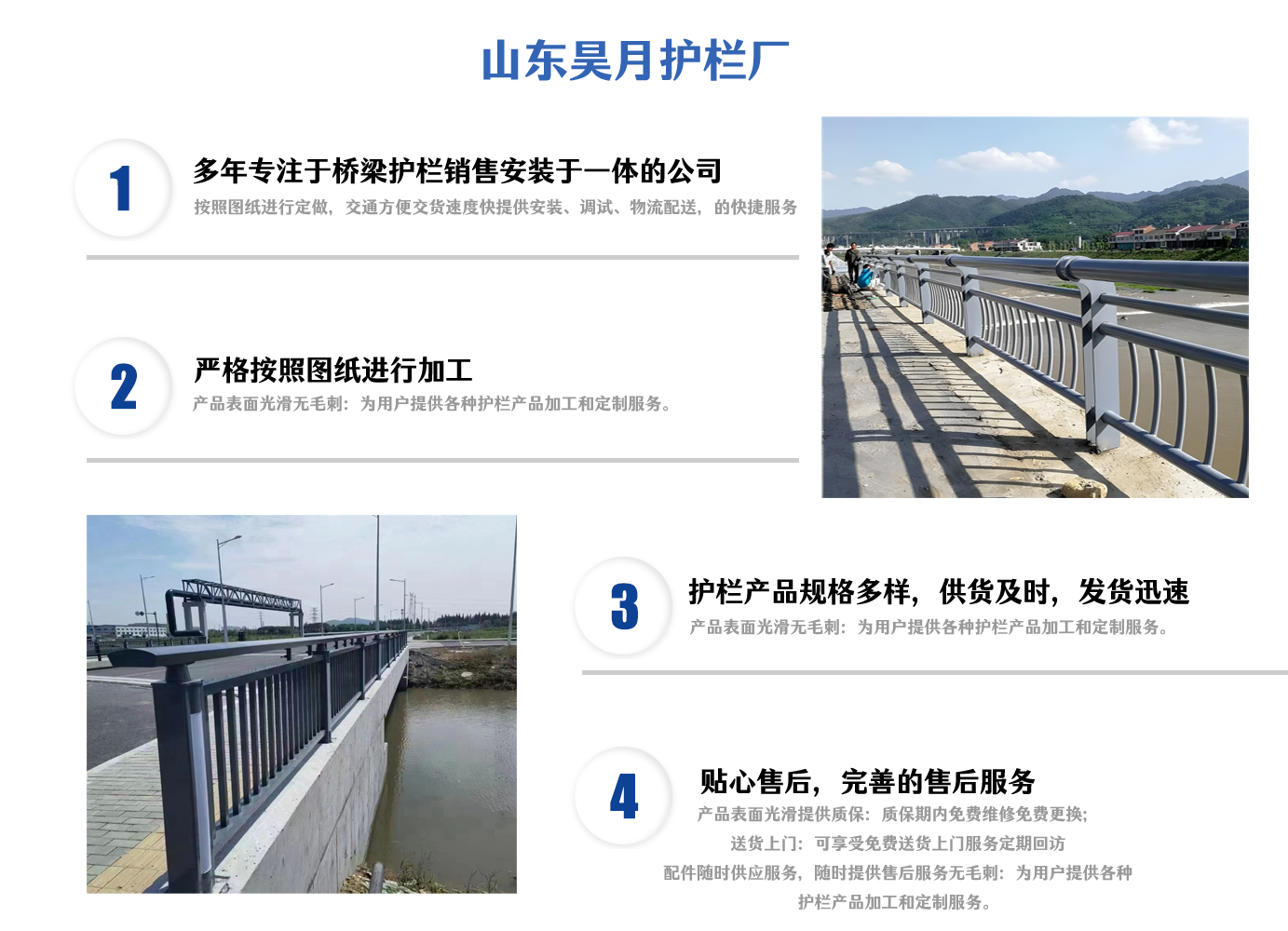Company Profile山東昊月金屬制品有限公司坐落于原材料豐富人文和諧交通發(fā)達及有“江北水城”之稱——聊城。 公司以科技興廠為宗旨,積極引進人才和技術(shù),不斷開拓創(chuàng)新. 主營產(chǎn)品:SS級橋梁防撞護欄,不銹鋼復(fù)合管護欄,鋁合金護欄,燈光護欄,河道護欄等等。產(chǎn)品本公司建立了一套科學(xué)的行之有效的質(zhì)量體系,擁有一支高技術(shù)、高素質(zhì)團隊,堅持以“誠信”為本,堅持“優(yōu)質(zhì)的質(zhì)量、貼心的服務(wù)”為崇高理念,為用戶提供質(zhì)優(yōu)價廉的產(chǎn)品提供至真至誠的服務(wù)。與客戶合作雙贏、攜手共創(chuàng)輝煌。 公司以科學(xué)的工藝、嚴格的質(zhì)量管理、完善的服務(wù)理念、合理的銷售價格贏得了良好的聲譽,建立了密切和愉快的合作關(guān)系。多年來,我們一直以良好的品質(zhì)、合理的價格,完善的質(zhì)量保障體系,完善的售后服務(wù)為客戶提供周到的服務(wù),滿足廣大客戶的需求。 我們以信譽求生存,以質(zhì)量去競爭,以真誠換合作,以效益求發(fā)展,是我們的服務(wù)宗旨。我們積極主動與同行加強交流與時俱進,邁向新的歷程!我們竭誠歡迎您的咨詢和洽談,愿與同行業(yè)的同胞們合作共贏。...
